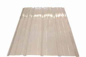 Impermeabilització de paret mitgera de fins a 12 m d'altura amb envà pluvial de plaques translúcides trapezoïdals de policarbonat, Onduclair PC Color "ONDULINE", color ivori RAL 1015, de 0,8 mm d'espessor, disposició de les plaques en filades cavalcades, fixades a la paret mitgera directament sobre el suport amb cargols galvanitzats; i acabament perimetral de planxa galvanitzada esmaltada, de varis colors.